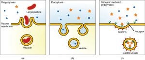 A variation of endocytosis is called pinocytosis. This literally means “cell drinking” and was named at a time when the assumption was that the cell was purposefully taking in extracellular fluid. In reality, this process takes in solutes that the cell needs from the extracellular fluid (Figure 7b).