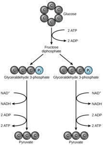Several additional enzymatic reactions occur (Figure 2), one of which requires an additional ATP molecule. At the end of the energy-requiring steps, the original glucose has been split into two three-carbon molecules, and two ATPs have been used as sources of energy for this process.