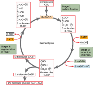 Figure 3 The Calvin cycle has three stages. In stage 1, the enzyme RuBisCO incorporates carbon dioxide into an organic molecule, 3-PGA. In stage 2, the organic molecule is reduced using electrons supplied by NADPH. In stage 3, RuBP, the molecule that starts the cycle, is regenerated so that the cycle can continue. Only one carbon dioxide molecule is incorporated at a time, so the cycle must be completed three times to produce a single three-carbon GA3P molecule, and six times to produce a six-carbon glucose molecule.