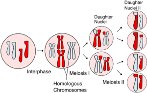 Figure 4 An overview of meiosis. Two sets of homologous chromosomes are shown. One set is comprised of a long red and a long blue chromosome. The second set is the two shorter chromosomes. During interphase, the chromosomes are duplicated so that in the second cell the look like X’s. These two connected copies are called sister chromatids. Photo credit Rdbickel; Wikimedia.