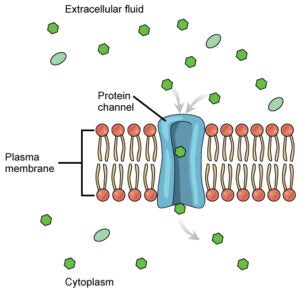 Figure 1 Facilitated transport moves substances down their concentration gradients. They may cross the plasma membrane with the aid of channel proteins. (credit: modification of work by Mariana Ruiz Villareal)